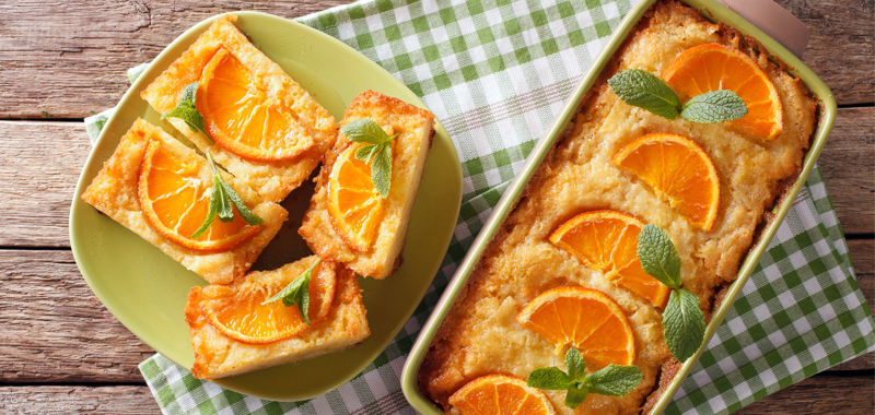 A la sortie du four, arroser le gâteau avec un sirop réalisé en mélangeant le jus d'orange et le sucre, le tout chauffé un peu pour faire le sirop.